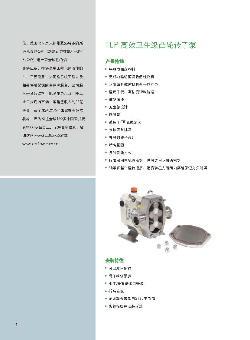 Johnson Pump品牌产品是由SPX Flow Technology Sweden AB (前身Johnson Pump AB)建立。专注于开发和制造工业、园艺和海洋用Johnson Pump泵和设备。通过多个销售公司和独立分销商在全球市场销售。75年的经验为液体输送需要的高质量标准提供解决方案。与客户一起创新,以设计、交付和服务高价值解决方案为核心,帮助满足和提升我们多元化社区的需求,并为其提供服务。公司的产品主要集中在旋转、驱动和液压技术,以及自动化过程系统,进入食品、饮料和工业市场。SPX FLOW的年收入约为15亿美元,业务遍及30多个国家,销售额遍布100多个国家。